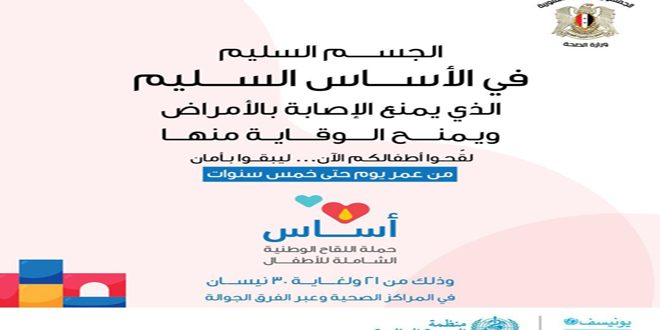 تُطلق وزارة الصحة غداً حملة اللقاح الوطنية الشاملة لمتابعة الأطفال المتسربين وتعزيز اللقاح الروتيني، وتستمر حتى الـ 30 من الشهر الجاري، وذلك خلال أوقات الدوام الرسمي في المراكز الصحية والفرق الجوالة في مختلف المحافظات.