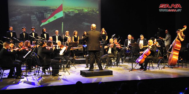 واختتمت الأمسية بأغنية لا كتب اسمك يا بلادي، التي جسدت معاني الولاء والانتماء للوطن، و”راياتك بالعالي يا سورية”، و”بانوراما سورية” محطات غنائية من المحافظات السورية.