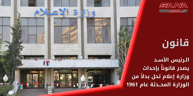 في سياق تحديث التشريعات الناظمة لعمل المؤسسات الحكومية، وبما يوفر لها آليات عمل تمكنها من ممارسة دورها الإشرافي والإداري والتنفيذي وفق تطورات العصر… أصدر السيد الرئيس بشار الأسد اليوم القانون رقم (19) لعام 2024 القاضي بإحداث وزارة الإعلام، لتحل محل الوزارة المحدثة بالمرسوم التشريعي رقم (186) عام 1961 بما لها من حقوق وما عليها من التزامات.