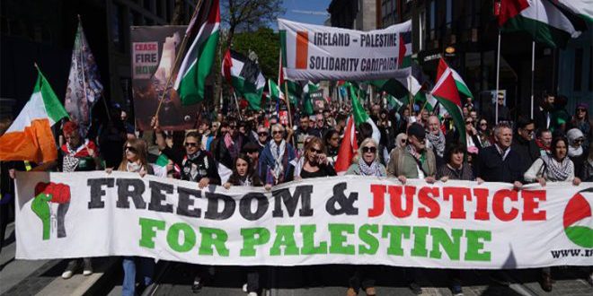 وكان عشرات آلاف الأشخاص بينهم فنانون، تظاهروا قبل أيام في العاصمة الإيرلندية دبلن ليعبروا عن تضامنهم مع الشعب الفلسطيني وللمطالبة بالحرية والعدالة له.