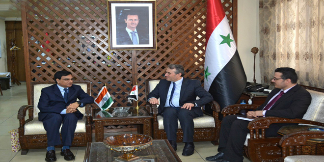بحث وزير الصناعة الدكتور عبد القادر جوخدار مع السفير الهندي بدمشق إرشاد أحمد سبل تعزيز التعاون وتطوير العلاقات في مختلف المجالات الصناعية وبناء القدرات والموارد البشرية.