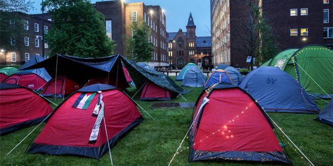 أقام طلاب من كلية ترينيتي المرموقة في العاصمة الإيرلندية دبلن مخيماً في حرم الجامعة احتجاجاً على العدوان الإسرائيلي الوحشي المستمر على غزة وتضامناً مع الشعب الفلسطيني.