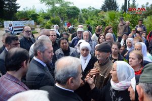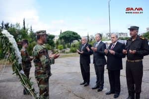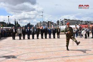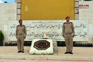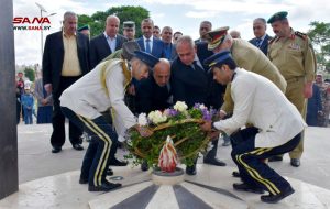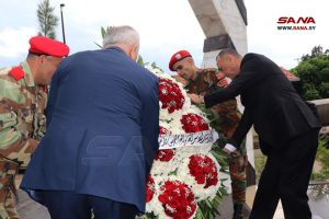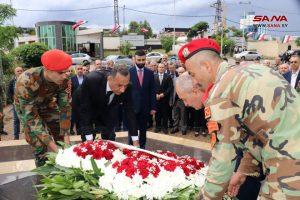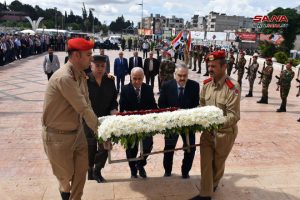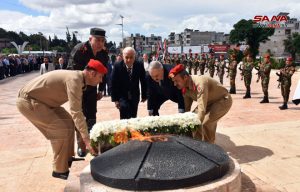 وبهذه المناسبة أيضاً زار محافظ حمص نمير مخلوف وأمين فرع حمص لحزب البعث العربي الاشتراكي عمر حورية وقائد شرطة المحافظة العميد أحمد الفرحان وشخصيات رسمية وشعبية روضة الشهداء “الفردوس” في حي الأرمن، ووضعوا أكاليل الورود على النصب التذكاري للشهداء، وقرؤوا الفاتحة على أرواحهم الطاهرة، حيث أكد حورية أن الكلمات تقف عاجزة أمام عظمة الشهادة وتضحيات الشهداء الذين تنحني الهامات إجلالاً لهم.
