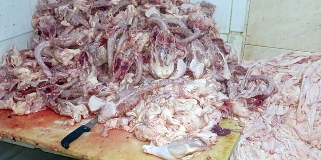 ضبط عناصر مديرية التجارة الداخلية وحماية المستهلك بريف دمشق نحو 800 كغ من نتر وعظام وجلود ورؤوس وظهور الفروج منها كمية غير صالحة للاستهلاك البشري قبل وصولها للأسواق للاتجار بها.