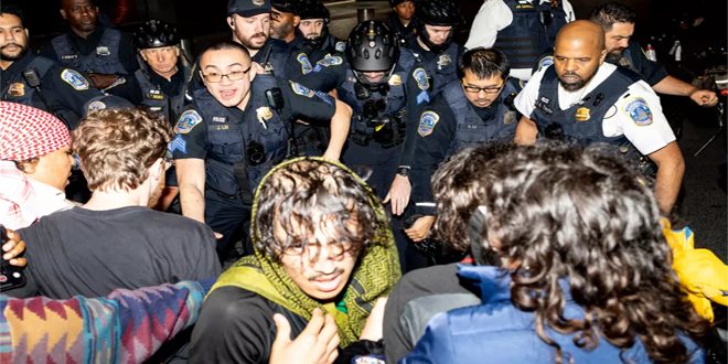 أخلت الشرطة الأمريكية بالقوة مخيماً تضامنياً مع الشعب الفلسطيني في جامعة جورج واشنطن في العاصمة الأمريكية، واعتقلت عشرات الطلاب الذين يتظاهرون منذ أيام احتجاجاً على العدوان الإسرائيلي على قطاع غزة.