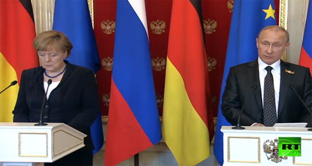 وخلال مؤتمر صحفي مع المستشارة الالمانية أنجيلا ميركل في موسكو أوضح بوتين أن “لدى روسيا وألمانيا وجهات نظر مختلفة تجاه الوضع في أوكرانيا لكن الجانبين يتوافقان على الحل السلمي”.