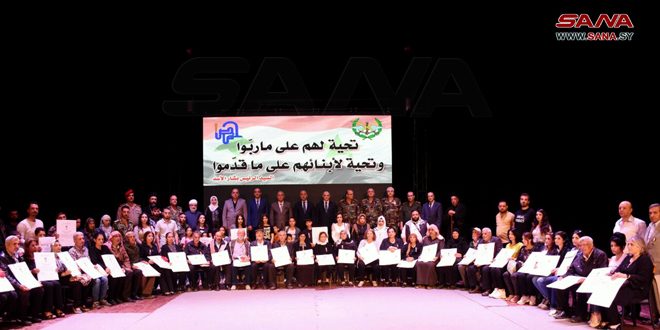 كرمت محافظة حمص اليوم بالتعاون مع مديرية شؤون الشهداء والجرحى والمفقودين في وزارة الدفاع أسر 300 شهيد على مسرح دار الثقافة بحمص.