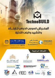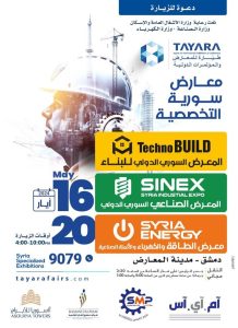 بمشاركة نحو 120 شركة محلية وعربية وأجنبية تنطلق مساء الخميس القادم سلسلة معارض سورية التخصصية، والتي تضم المعرض السوري الدولي للبناء والتشييد والبنى التحتية “تيكنوبيلد”، ومعرض الطاقة والكهرباء والأتمتة الصناعية “سيريا إنيرجي”، والمعرض الصناعي السوري الدولي “سينكس”.