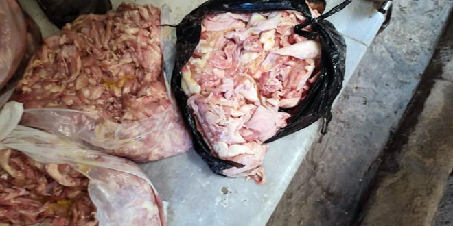 كما تم إتلاف 26 كيلوغراماً من مخلفات الفروج نتر وجلود في محلين لبيع الكباب والفروج المقطع في سقبا والقزاز.