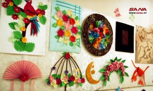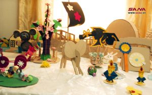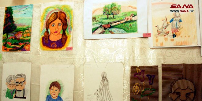 قدم أطفال معهد التربية الخاصة للإعاقة السمعية بالسويداء أعمالاً جمعت بين الرسومات والمشغولات اليدوية ضمن المعرض الفني الذي افتتحته مديرية الشؤون الاجتماعية والعمل بالسويداء اليوم في مقر المعهد.