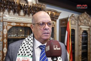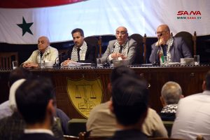 المحامي والباحث التاريخي محمد أقبيق أكد في كلمته أن المحامين السوريين يعملون وفق القانون الدولي بالتركيز على القضية الفلسطينية في المحافل الدولية، مبيناً أن الدولة الفلسطينية موجودة عبر التاريخ في حين أن “إسرائيل” هي الكيان الوحيد الذي نشأ بقرار دولي.