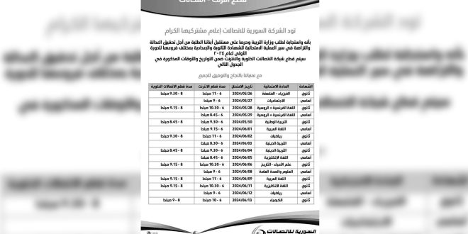 حددت الشركة السورية للاتصالات أوقات قطع شبكة الاتصالات الخلوية والإنترنت خلال امتحانات شهادتي الثانوية بكل فروعها والتعليم الأساسي بكل فروعها للدورة الأولى لعام 2024.