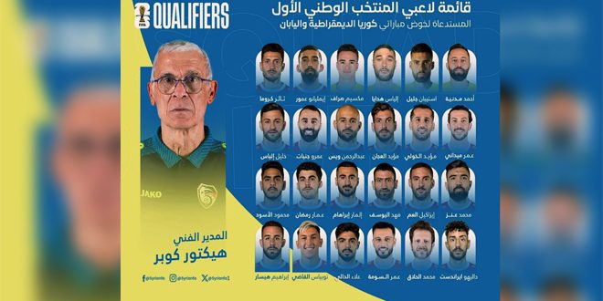 أعلن الأرجنتيني هيكتور كوبر مدرب منتخب سورية الأول لكرة القدم القائمة التي ستخوض مواجهتي كوريا الديمقراطية في لاوس واليابان في هيروشيما مطلع الشهر القادم ضمن تصفيات كأسي العالم وآسيا.