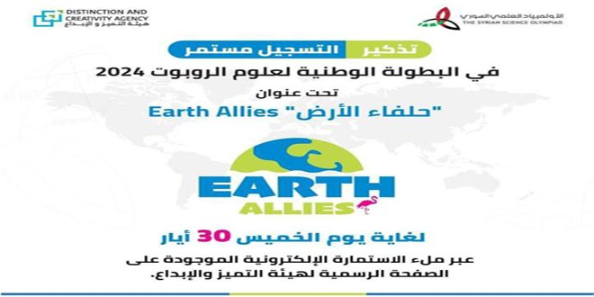 ودعت إدارة الأولمبياد في بيان تلقت سانا نسخة منه اليوم هواة الروبوتيك من كل المراحل الدراسية بجميع المحافظات للمشاركة في البطولة عبر ملء الاستمارة الإلكترونية الموجودة على الموقع الإلكتروني لهيئة التميز والإبداع، مبينة أن منافسات البطولة ستقام في الأسبوع الأوّل من شهر تموز المقبل تحت عنوان حلفاء الأرض ضمن ثلاثة تجمعات رئيسية في دمشق وحمص واللاذقية.