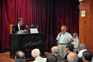 حضر المحاضرة رئيس اللجنة الشعبية العربية السورية لدعم الشعب الفلسطيني الدكتور صابر فلحوط، وعدد من ممثلي البعثات الدبلوماسية في دمشق، إضافة إلى قادة وممثلي الفصائل الفلسطينية والأحزاب الوطنية السورية والفلسطينية، ونخبة من الباحثين والمهتمين.