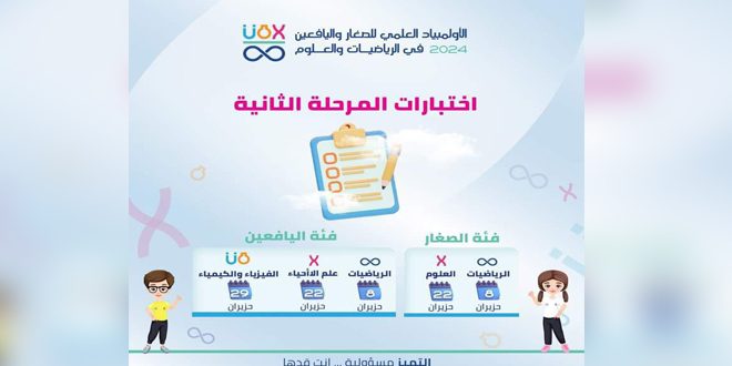 أعلنت إدارة الأولمبياد العلميّ السوريّ في هيئة التميّز والإبداع مواعيد بدء اختبارات المرحلة الثانيةلمنافسات الأولمبياد العلميّ للصغار واليافعين لعام 2024.
