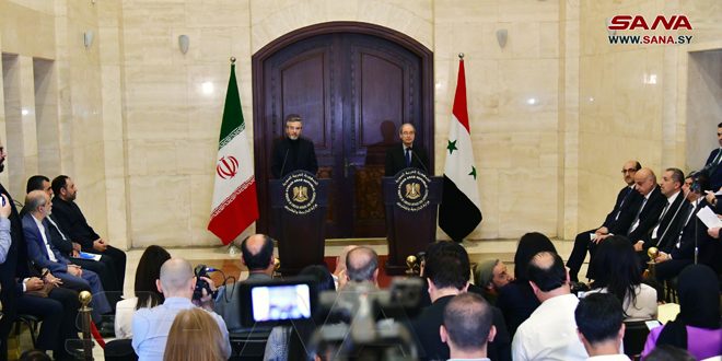 أكد وزير الخارجية والمغتربين الدكتور فيصل المقداد عمق العلاقات الإستراتيجية التي تربط سورية وإيران والتعاون المستمر لتعزيزها، بما يخدم مصلحة شعبيهما، مشيراً إلى أن موقف البلدين واحد حيال القضية الفلسطينية وضرورة وقف العدوان الإسرائيلي على قطاع غزة وتحقيق التطلعات المشروعة للشعب الفلسطيني.