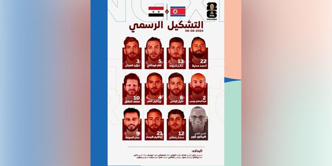 أعلن المدير الفني لمنتخب سورية الأول بكرة القدم هيكتور كوبر التشكيلة التي سيخوض بها منتخبنا مباراته مع منتخب كوريا الديمقراطية في وقت لاحق اليوم في لاوس ضمن الجولة الخامسة ما قبل الأخيرة من دور المجموعات للتصفيات المشتركة لكأس العالم وكأس آسيا.