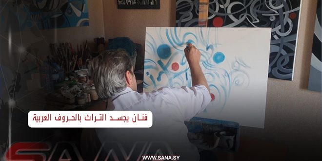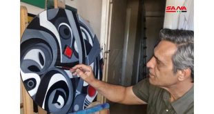 حلب-سانا بهدف إبراز جمالية الحرف العربي يعمل الفنان التشكيلي خلدون الاحمد في التكوينات الحروفية بعد …