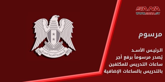 أصدر السيد الرئيس بشار الأسد المرسوم رقم (121) لعام 2024 القاضي برفع أجر ساعات التدريس للمكلفين بالتدريس بالساعات الإضافية في مدارس التعليم الأساسي والمدارس الثانوية والثانويات المهنية والصناعية ومراكز التدريب المهني سواء أكانوا من داخل الملاك أم من خارجه.