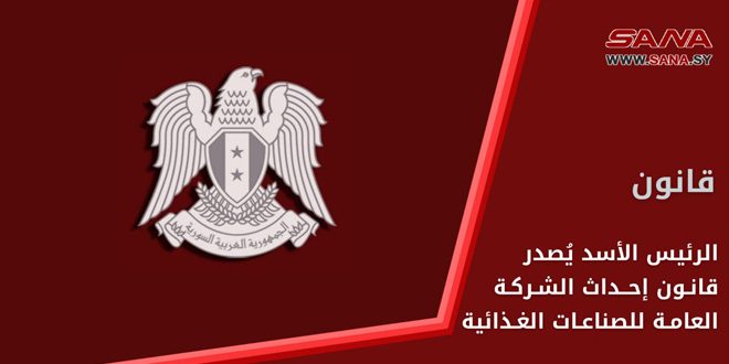أصدر السيد الرئيس بشار الأسد اليوم القانون رقم (22) لعام 2024، القاضي بإحداث “الشركة العامة للصناعات الغذائية” لتحل محل كل من المؤسسة العامة للصناعات الغذائية المحدثة عام 1975 والمؤسسة العامة للسكر، والشركات التابعة لهما.