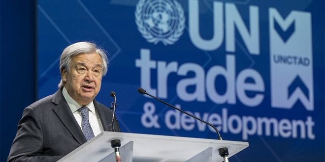 ونقلت وكالة نوفوستي عن غوتيريش قوله في خطاب ألقاه في فعالية بمناسبة الذكرى الستين لإنشاء مؤتمر الأمم المتحدة للتجارة والتنمية “إن البنية المالية الدولية قديمة وغير فعالة وغير عادلة ولم تتمكن من ضمان أمن الدول النامية الغارقة في الديون بينما يواجه النظام التجاري الدولي مشكلات في جميع المجالات وهو على وشك التفتت” مشيراً إلى أن التجارة تحولت إلى سيف ذي حدين وتعد اليوم مصدراً لعدم المساواة والترابط والاعتماد والابتكار الاقتصادي والتدهور البيئي على حد سواء.