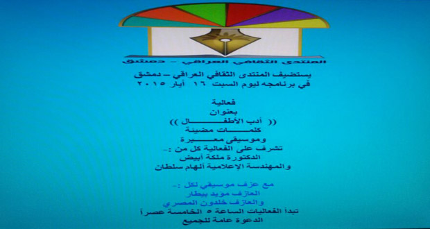 يستضيف المنتدى الثقافي العراقي بدمشق فعالية ثقافية بعنوان “أدب الأطفال.. كلمات مضيئة وموسيقا معبرة” بإشراف الدكتورة ملكة أبيض والإعلامية الهام سلطان وذلك عند الخامسة من عصر السبت القادم والدعوة عامة.