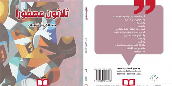 اقتصرت مجموعة (ثلاثون عصفوراً) الجديدة للشاعر عبد الكريم شعبان على الشعر الحديث الذي تضمن نصوصاً عكست العلاقة النفسية بين الشاعر ومؤثرات المجتمع والبيئة.