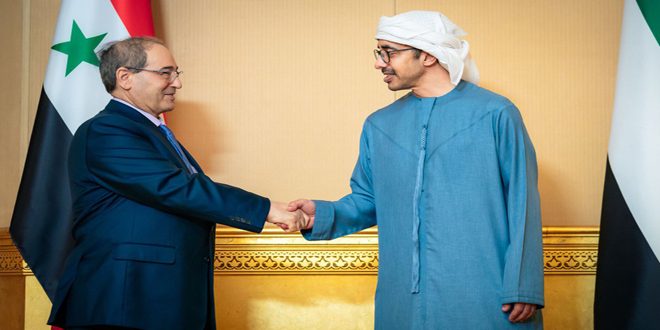 عقد الدكتور فيصل المقداد وزير الخارجية والمغتربين في إطار زيارته الحالية لدولة الإمارات العربية المتحدة الشقيقة لقاء مع الشيخ عبد الله بن زايد آل نهيان وزير خارجية دولة الإمارات.