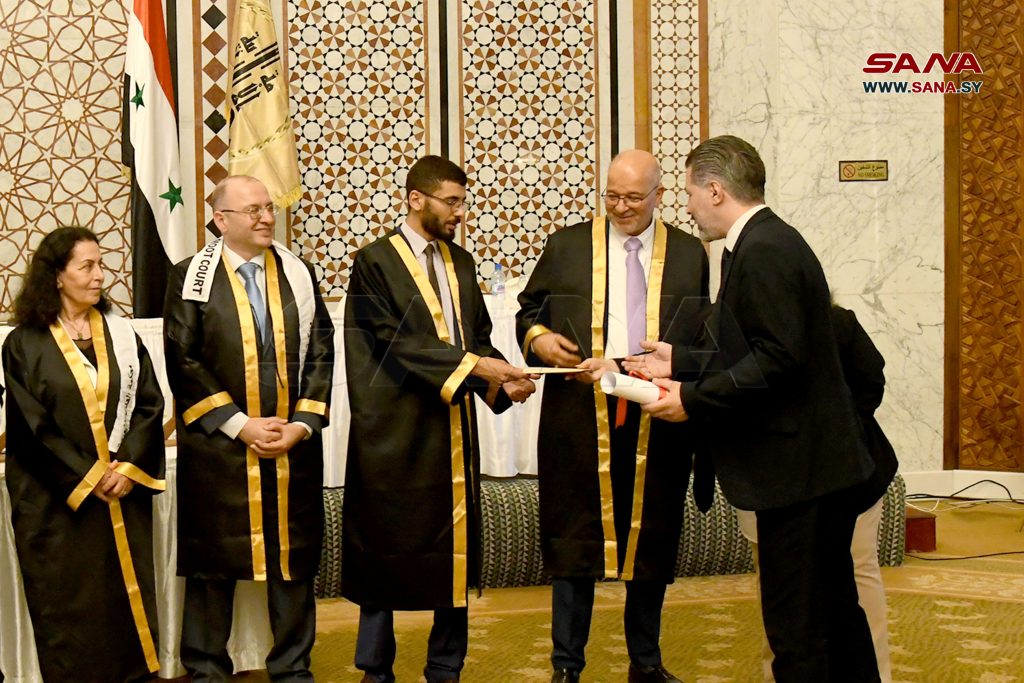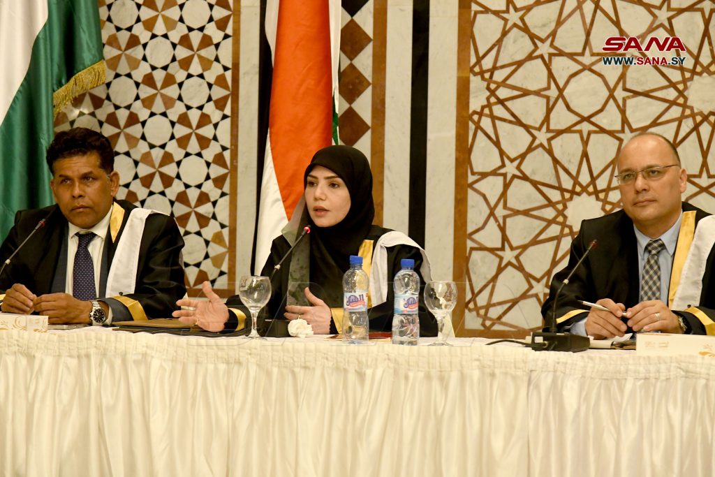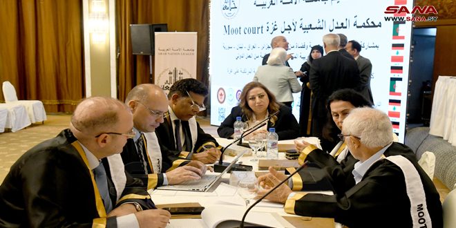 واستمعت هيئة المحكمة إلى مجموعة من المرافعات المقدمة من طلاب الدراسات العليا “الدكتوراه” في مجال القانون الدولي من جامعات سورية وعربية، وذلك ضمن مسابقة “أفضل المرافَعات القانونية ضد جرائم الصهيونية المرتكبة والمتواصل في قطاع غزة”.