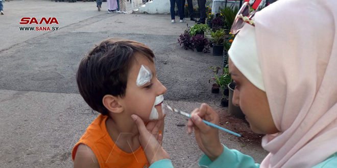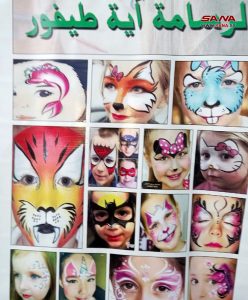 على طاولة صغيرة في معرض الزهور الدولي بدورته الـ 44، والمقام في حديقة تشرين بدمشق، ترسم الفنانة الشابة آية طيفور 24 عاماً الفرح على وجوه الأطفال، من خلال تزيين وجوههم بالشخصيات الكرتونية المحببة، باستخدام الألوان الزاهية.