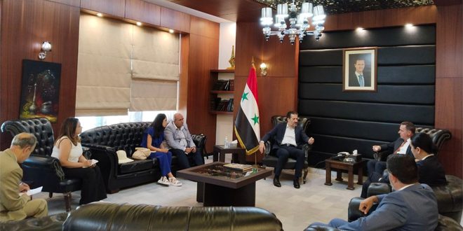 الوزير المنجد أكد خلال اللقاء أهمية الدعم الفني الذي تقدمه المنظمة للوزارة في مجالات تفتيش العمل وبناء قدرات العاملين بمنظومة الحماية الاجتماعية والضمان الاجتماعي، ودعم المؤسسة العامة للتأمينات الاجتماعية.