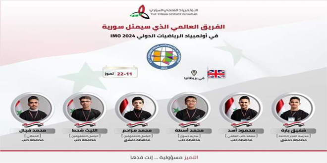 وذكرت هيئة التميز والإبداع في بيان تلقت سانا نسخة منه اليوم أن الفريق السوري يضم كلاً من الطلاب محمد أسطة ومحمود أسد والليث شحط ومحمد فجال من حلب ومحمد مزاحم وشفيق بارة من دمشق.