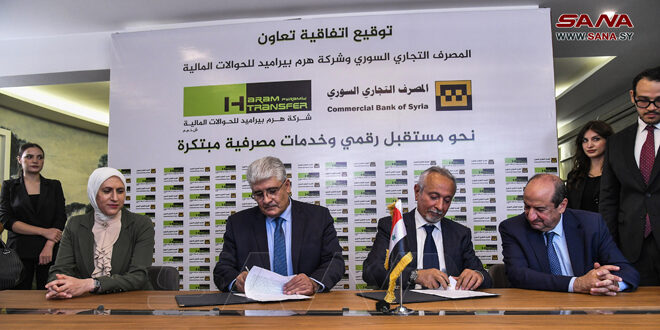 وقع المصرف التجاري السوري وشركة هرم بيراميد للحوالات المالية اتفاقية تعاون يتم بموجبها تقديم العديد من الخدمات منها الإيداع والسحب عبر التحويل الفوري والمباشر من والى حساب البطاقة المصرفية للتجاري عن طريق فروع الشركة الأمر الذي من شأنه تخفيف أعباء الموظفين في الحصول على مستحقاتهم ورواتبهم.