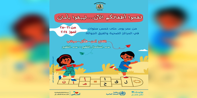 وتهدف الحملة التي تحمل عنوان “اللقاح أساس … لقحوا أطفالكم ليبقوا بأمان” إلى التأكد من استكمال الأطفال جميع اللقاحات المدرجة في برنامج التلقيح الوطني ومتابعة الأطفال المتسربين منه، وإعطائهم اللقاحات المستحقة وتزويدهم ببطاقة لقاح جديدة في حال عدم وجودها وفق مديرة الرعاية الصحية الأولية في الوزارة الدكتورة رزان الطرابيشي.
