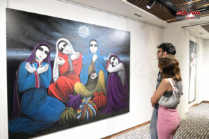 المعرض الذي تستضيفه جوليا آرت غاليري يضم 15 لوحة بأحجام كبيرة وبتقنية الأكريليك بأسلوب تعبيري خاص رسمت أغلبها الفنانة خلال الحرب على غزة فعكست عبرها الألم والحزن والصمود عند الإنسان الفلسطيني، معتمدة رمزية المرأة كحامل أساسي للموضوع مع إظهار التعاطف ومعايشة يوميات أهل فلسطين.