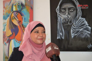وعكست الفنانة قمر منعم في لوحتها الإنسان المظلوم, كما قالت من خلال رسم بورتريه بألوان الإكريليك والفحم ليكون الوشاح الأبيض رمزاً للتفاؤل والأمل، ووجدت في تنوع الأعمال فرصة للمشاهدة والتقييم والمناقشة والتعلم على نحو أوسع.