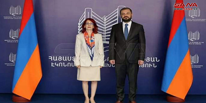 بحث وزير الاقتصاد الأرميني كيفورك بابويان وسفيرة سورية في أرمينيا نورا أريسيان التحضيرات لعقد اجتماع اللجنة الحكومية المشتركة بين سورية وأرمينيا.