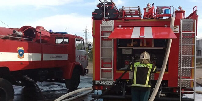 وأضاف سميرنوف: “إن فرق الإطفاء المكونة من 82 من رجال الإنقاذ و32 مركبة خاصة تتعامل مع الموقف، وقد تم إخماد النيران في أحد الخزانات في الوقت الحالي”.