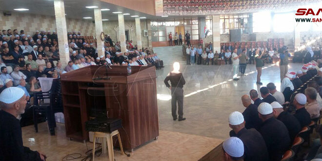 ونقل الحلبي محبة أهالي الجولان المحتل إلى أهلهم في سورية قيادة وجيشاً وشعباً، ومواصلتهم طريق النضال والمقاومة حتى تحرير كامل ترابه، لافتاً إلى الإرث الوطني الذي يحمله أهالي الجولان ومقارعتهم للغزاة منذ الاحتلال الفرنسي وصولاً إلى الاحتلال الإسرائيلي.