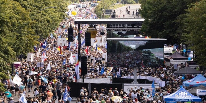 شارك آلاف الأشخاص في مظاهرة تحت شعار “الوحدة والقانون والحرية” وسط العاصمة الألمانية برلين، مطالبين بالسلام والحرية والديمقراطية، ورافضين إمدادات الأسلحة إلى مناطق الصراعات.