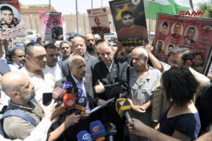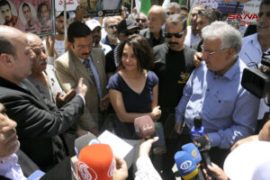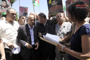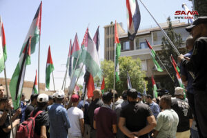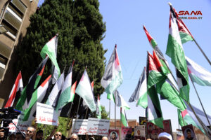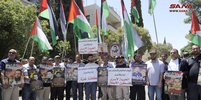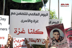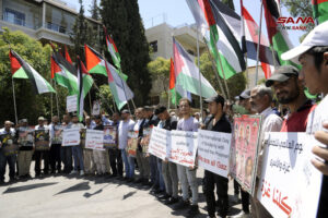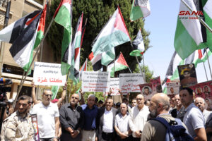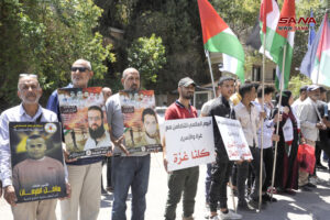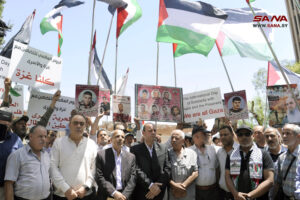 وحمل المشاركون بالوقفة العلمين السوري والفلسطيني وصوراً للأسرى في معتقلات الاحتلال ولافتات عبرت عن التضامن مع أهالي غزة، منددين بالجرائم والانتهاكات الإسرائيلية اليومية بحق المدن والقرى الفلسطينية وعمليات القتل الممنهجة والاعتقالات بالضفة الغربية والقدس المحتلة، في إطار المشروع الصهيوني القائم على الاستيطان والضم والتهجير وتقويض أي إمكانية لنيل الشعب الفلسطيني حقوقه الوطنية المشروعة.