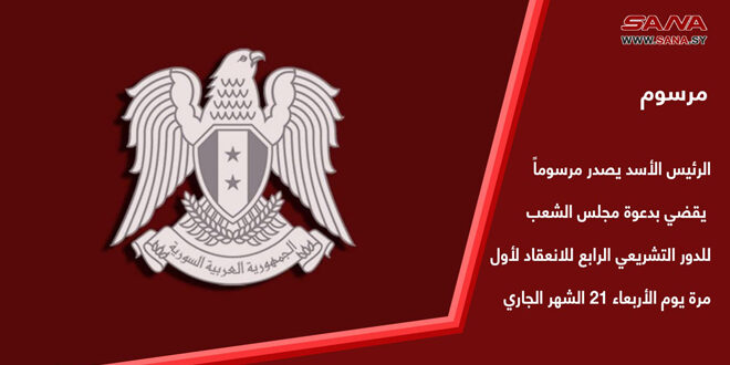 المادة 1- يدعى مجلس الشعب للدور التشريعي الرابع للانعقاد لأول مرة يوم الأربعاء المصادف في 21/8/2024.