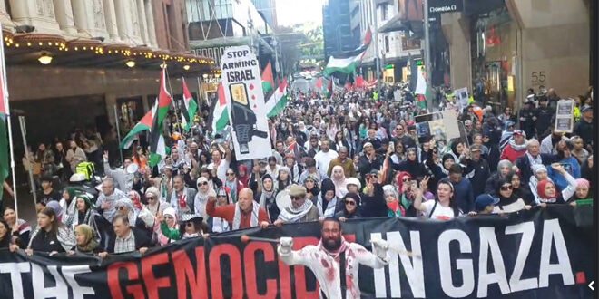 تظاهر الآلاف في مدينة سيدني الأسترالية، دعماً للشعب الفلسطيني، وتنديداً بمجازر الاحتلال الإسرائيلي في قطاع غزة، وللمطالبة بوقف العدوان المستمر على القطاع منذ عشرة أشهر.