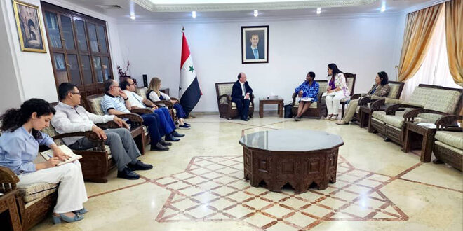 بحث وزير التعليم العالي والبحث العلمي الدكتور بسام إبراهيم مع ممثلة صندوق الأمم المتحدة للسكان في سورية مورييل مافيكو والوفد المرافق، آليات التعاون المشترك في المجال العلمي والتدريب والتأهيل المهني ودعم الأبحاث العلمية في المجالين الطبي والمجتمعي.