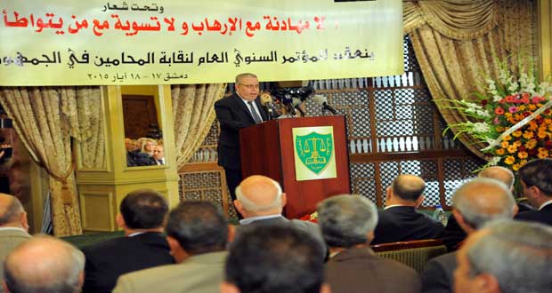انطلقت اليوم أعمال المؤتمر العام السنوي لنقابة المحامين بعنوان “لا مهادنة مع الإرهاب ولا تسوية مع من يتواطأ مع الأجنبي” وذلك في فندق الشام بدمشق.