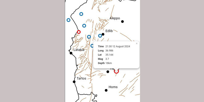 وذكر المركز الوطني للزلازل في بيان على صفحته في فيسبوك أن الهزة وقعت عند الساعة 19.30 مساءً شرق مدينة حماة على بعد نحو 21 كيلومتراً.