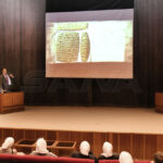 وتناولت المحاضرة التعريف بالكتابات المسمارية السورية التي ذكرت فيها غزة وعدد من المدن الفلسطينية مثل اللغة المسمارية الإيبلائية، إضافة إلى أهمية دراسة النقوش المسمارية المكتشفة في الشرق القديم في تصويب الحقائق، كما تطرقت المحاضرة إلى الأدلة الآثارية التي أثبتت أن نظرية المثلثات وأشباه المنحرف والدائرة دونت أولاً في منطقه الشرق القديم لأول مرة في بلاد الرافدين وفي مملكة أوجاريت السورية، كما عرفت النظريات الهندسية قبل اليونانيين بزمن بعيد وهو ما أثبتته النصوص المسمارية الأوجاريتية.