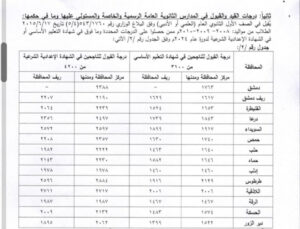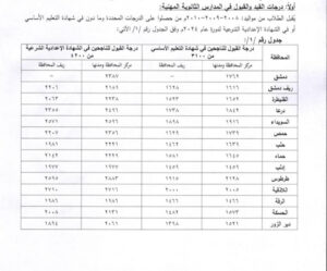 وحددت الوزارة الحد الأدنى للقبول في الأول الثانوي العام في دمشق 1763 درجة وفي ريف دمشق 1617 وفي ريف محافظة ريف دمشق 1629 وفي القنيطرة 1653 درجة وفي ريفها 1524 وفي درعا 1843 وفي ريفها 1739 وفي السويداء 1917 وفي ريفها 1899 وفي حمص 1740 وفي ريفها 1630 وفي حلب 1640 وفي ريفها 1463 وفي حماة 1646 وفي ريفها 1582 وفي إدلب وريفها 1460 وفي طرطوس 2129 وفي ريفها 1916 وفي اللاذقية 2006 وفي ريفها 2001 وفي الرقة وريفها 1467 وفي الحسكة 1574 وفي ريفها 1483 وفي دير الزور 1522 وفي ريفها 1399.