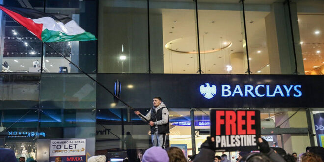 نفذ متضامنون مع الشعب الفلسطيني وقفة احتجاجية داخل مبنى يضم مكاتب بنك “باركليز” البريطاني في مدينة برمنغهام تنديداً بتمويل المصرف لشركات السلاح الإسرائيلية.
